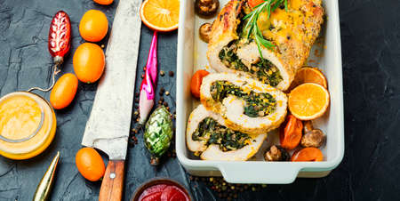 Turkey meatloaf with spinach and mushrooms.Meat roll with kumquat and orange sauce.Christmas dish