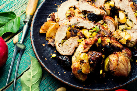 Baked pork with dates, apples and pistachios. Roasted lean pork. Stuffed pork roll