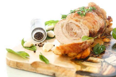 Appetizing roll roast with autumn plum and nuts.Pork porchetta.Copy space