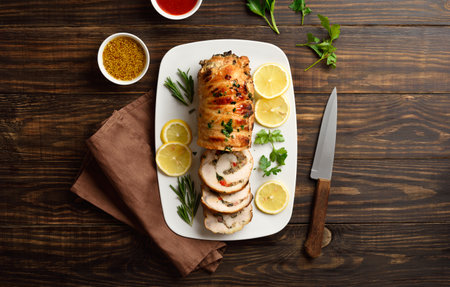 Sliced diet pork roll stuffed with mushrooms, red bell pepper, spinach on white plate on brown wooden table. Top view, flat lay