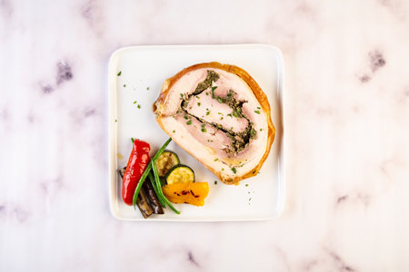 Roasted pork tenderloin stuffed with green vegetables, wrapped in Black Forest ham, garnished with Parmesan flakes. Exquisite French cuisine.