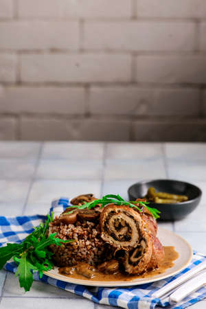Beef meat rolls stuffed with mushrooms and greens. Homemade baked beef. Space for text