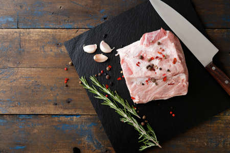 Piece of Raw Pork, a knife for meat and ingredients for cooking on black slate. Place for text on wooden rustic background top view