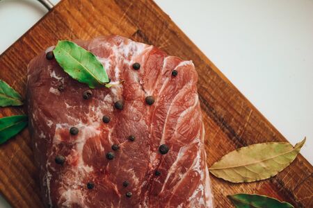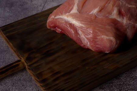 Raw Pork meat fillet. Fresh Pork meat, piece of meat close up. Prime filet meat texture. Chilled pork Boston butt, collar, shoulder. Steak. Raw pork neck, Spices. On wooden table b