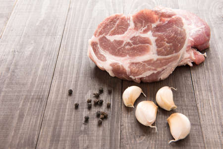 Top view raw pork chop steak and garlic, pepper on wooden background.