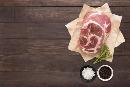 dark wooden background in retro, grunge style. Pork neck tenderloin. Also near spices and seasonings for its preparation,
