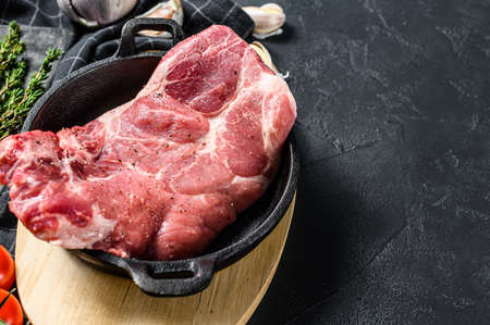 Raw pork neck meat piece for Chop steak in wooden tray with herbs. Black background. Top view