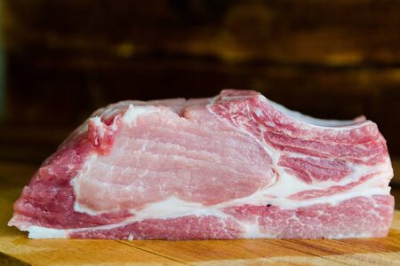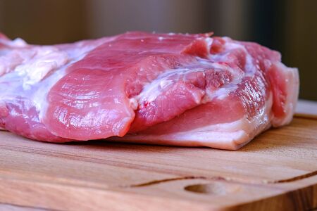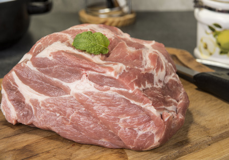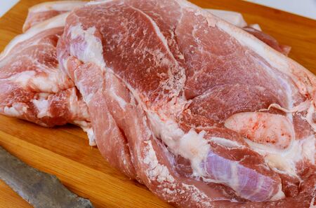 Raw neck pork on kitchen table ready to be cut and cook.