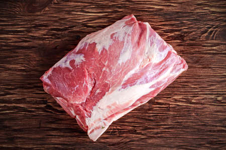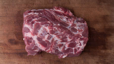 Overhead view of raw cuting pieces of pork on wooden background. Piece of fresh boneless pork, neck part or collar. Big piece of red raw meat on a wooden background