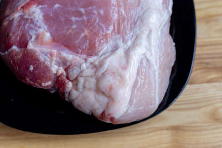 Raw Pork is prepared for Cook, It is on wood plate on black granite kitchen counter tabletop, shot by studio light. Clipping Paths.