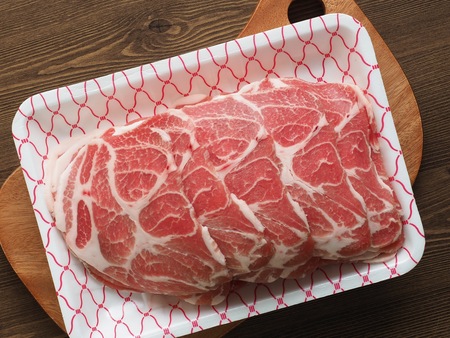Top view of pork collar sliced as a background in the market for sale at Thailand, fresh meat for grill, Shabu