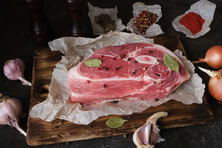 Raw pork shoulder with spices. Bay leaf, garlic. On a stone background, copy space, close up