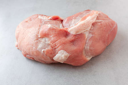 Fresh cut of pork loin on light grey kitchen table, raw meat