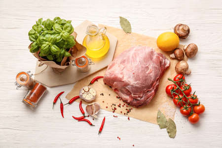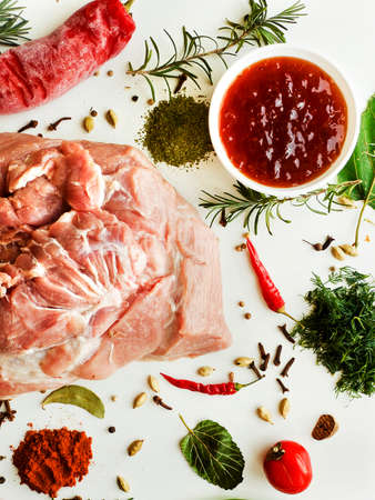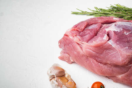 Raw meat, piece of pork with seasonings set, on white stone table background, with copy space for text