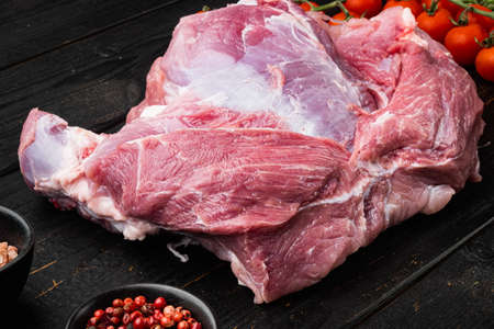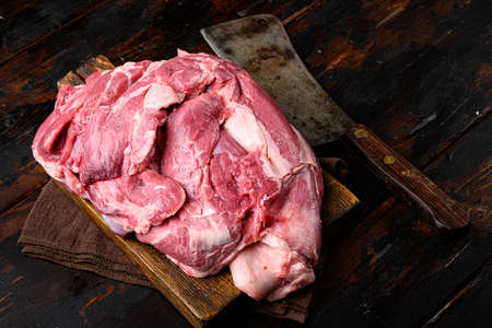 Raw lamb shoulder meat ready for baking set, on old dark wooden table background