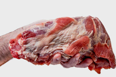 Raw pork meat in a man's hand on a white background.