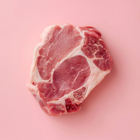 A close-up image of a fresh raw pork chop on a clean white surface, perfect for use in culinary projects and recipes. Ideal for meat and cooking enthusiasts.