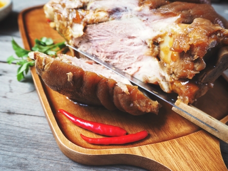 Cutting a piece of meat on a wooden cutting board. Close up image