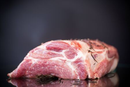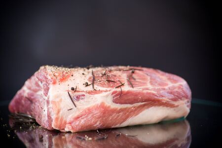 pork piece raw meat with spices and rosemary on a black background