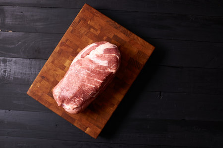 A piece of red raw beef meat on wooden cutting Board Dark background. Copy space