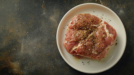 A close-up view of raw meat seasoned with spices on a white plate, ideal for food photography, culinary art, and kitchen themes in a rustic setting.