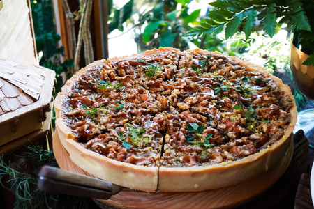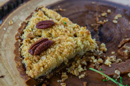 nut pie sweet dessert on wood dish in cafe