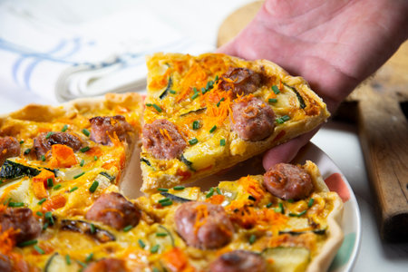 French pork sausage quiche with vegetables, egg and cheese.