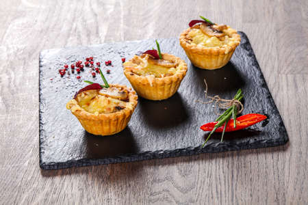 Mini pie from meat and mushrooms in wooden tray on loft background