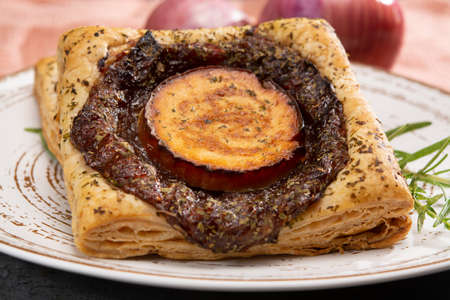 French traditional rustic onion Tarte tatin with balsamic vinegar, caramel and Provence herbs