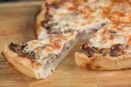 French quiche with wild mushrooms, egg, and beef on a wooden table.