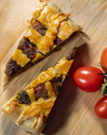 Sliced pie stuffed with meat and chicken