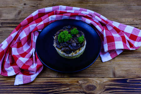 Salad with roasted mushrooms, eggs, boiled potato, cheese and mayonnaise on wooden table