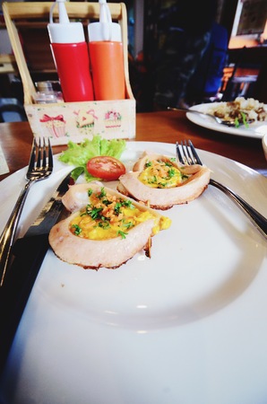 romantic breakfast , heart-shaped fried eggs with sausage with toast