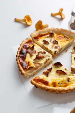 Piece of quiche with chanterelles, herbs and cheese on a white plate