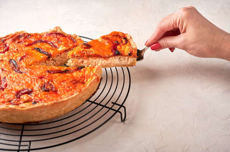 Womans hand holds on a shoulder blade piece of homemade quiche pie with chicken, dried tomatoes, cheddar cheese on ceramic plate