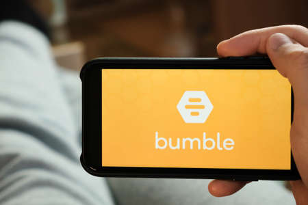 Bumble application on the smartphone in mans hand. Man laying and using application for dating and meeting. Social network concept, July 2020, Prague, Czech Republic.