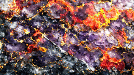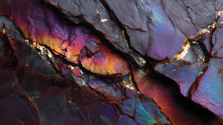 Abstract close-up of an iridescent rock texture featuring vibrant colors and shimmering gold veins. Modern and luxurious.