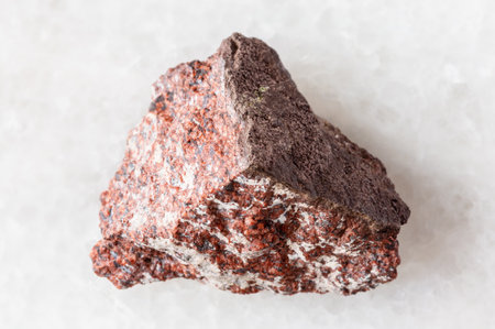 closeup of sample of natural mineral from geological collection - unpolished Nepheline Syenite rock on white marble background