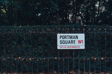 London, UK - December 5, 2020: Street name sign on a fence in Portman Square, City of Westminster, a borough that occupies much of the central area of London including most of the West End.