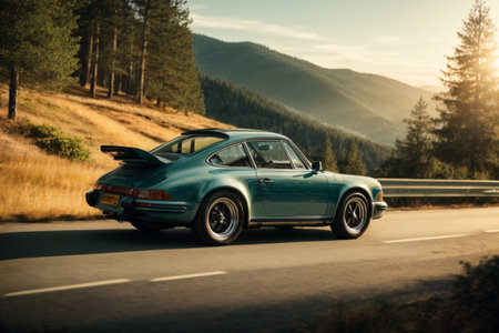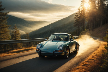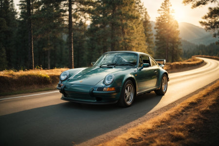 a high speed green sports car with aerodynamic features driving on a sunset road showcasing motion, performance, and scenic beauty