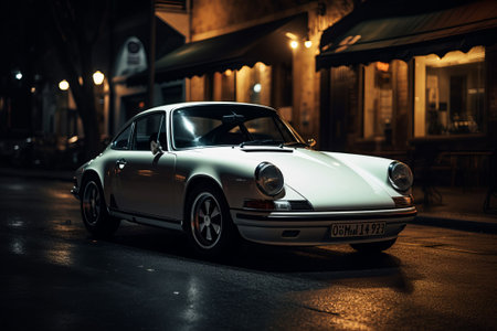 An AI generated illustration of an old vintage car parked in a quaint town at night