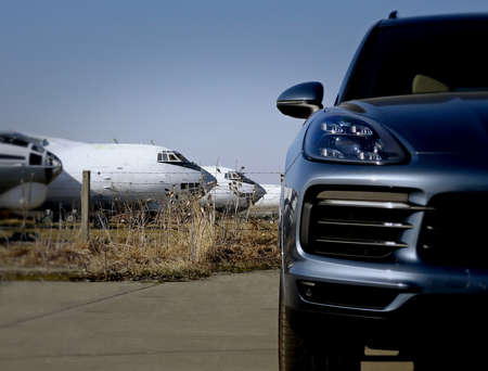 Mulhouse - France - 19 August 2019 - Closeup of blue Porsche Macan front light parked in the street
