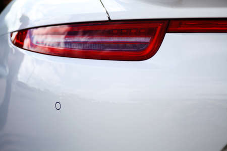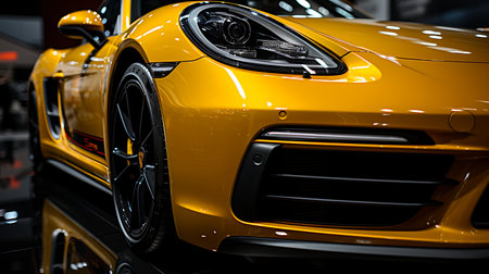 Close-up of luxury sports car showcased at auto show. New car in dealers showroom