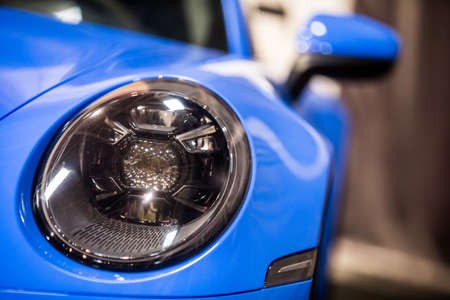Modern Automotive Industry Background with Deep Blue Sporty Car Headlight Close Up.