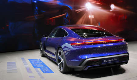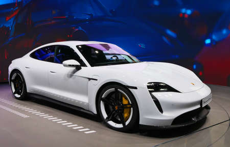 FRANKFURT, GERMANY - SEP 11, 2019: New Porsche Taycan Turbo S sports car reveiled at the Frankfurt IAA Motor Show 2019. - Image