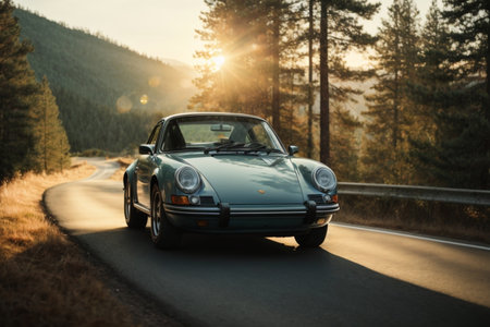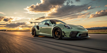 a high speed green sports car with aerodynamic features driving on a sunset road showcasing motion, performance, and scenic beauty