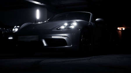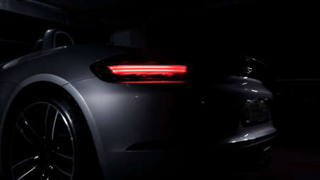 ST. PETERSBURG, RUSSIA - 12 DECEMBER 2020: Silver Porsche 718 Boxter stands in the parking lot rear lights close-up