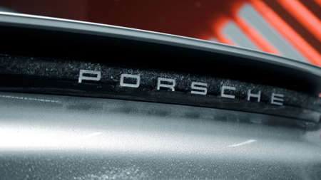 ST. PETERSBURG, RUSSIA - 12 DECEMBER 2020: Silver Porsche 718 Boxter stands in the open air at night, it is snowing. close-up logo