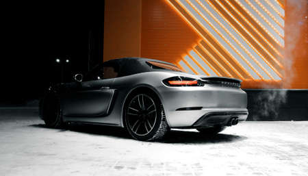ST. PETERSBURG, RUSSIA - 12 DECEMBER 2020: Silver Porsche 718 Boxter stands in the open air at night, it is snowing. Back view