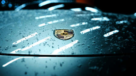 Bucharest, Romania - October 23, 2019: Illustrative editorial close up shot of the Porsche 911 Carrera GTS logo on a car. Porsche is a brand of German automobile.